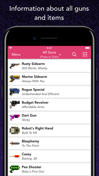 ابحث بسرعة عن كل المعلومات التي تحتاجها حول لعبة "Enter the Gungeon" مع الدليل الشامل. هذا التطبيق لجهاز iPhone هو مصدر قيم للاعبين، حيث يوفر ميزة البحث العالمية التي تتيح لك الوصول بسهولة إلى معلومات مفصلة حول العناصر والأعداء التي تواجهها أثناء اللعب.